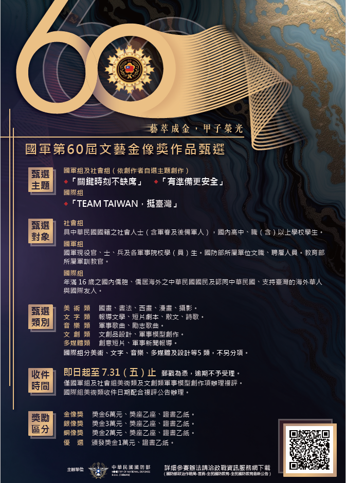 「國軍第60屆文藝金像獎」作品甄選 2026-04-24 最新消息 「國軍第60屆文藝金像獎」作品甄選歡迎教職員生,就美術、文字、音樂、文創、多媒體等五類,於7月31日前提供相關作品參與甄選。相關資訊可洽專責導師室翁勇智教官 分機1411 You Might Also Like 全民國防手冊 2022-07-28 軍訓教官人事評審委員會設置要點 2026-04-02 有關本校近期重要校園安全宣導叮嚀 2019-12-06