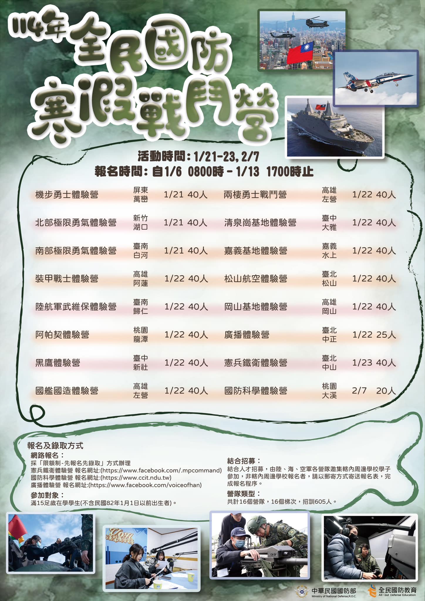 寒假戰鬥營 2025-12-23 最新消息 國防部規劃115年1月27日至2月6日辦理16梯次「寒假戰鬥營」,招訓對象為本國籍同學,有意願參加同學可至『軍訓室』找翁勇智教官(分機1411)拿報名表。 You Might Also Like 全民國防教育軍事訓練課程折抵兵役程序 2024-12-04 全民國防手冊 2022-07-28 全民國防教育軍事訓練課程-課綱內容異動 2025-09-23